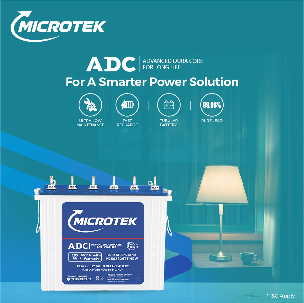 250Ah Tall Tubular Battery: Comes with Microtek’s M2503624TT Dura Strong Battery for extended backup, heavy load support, and deep discharge protection.