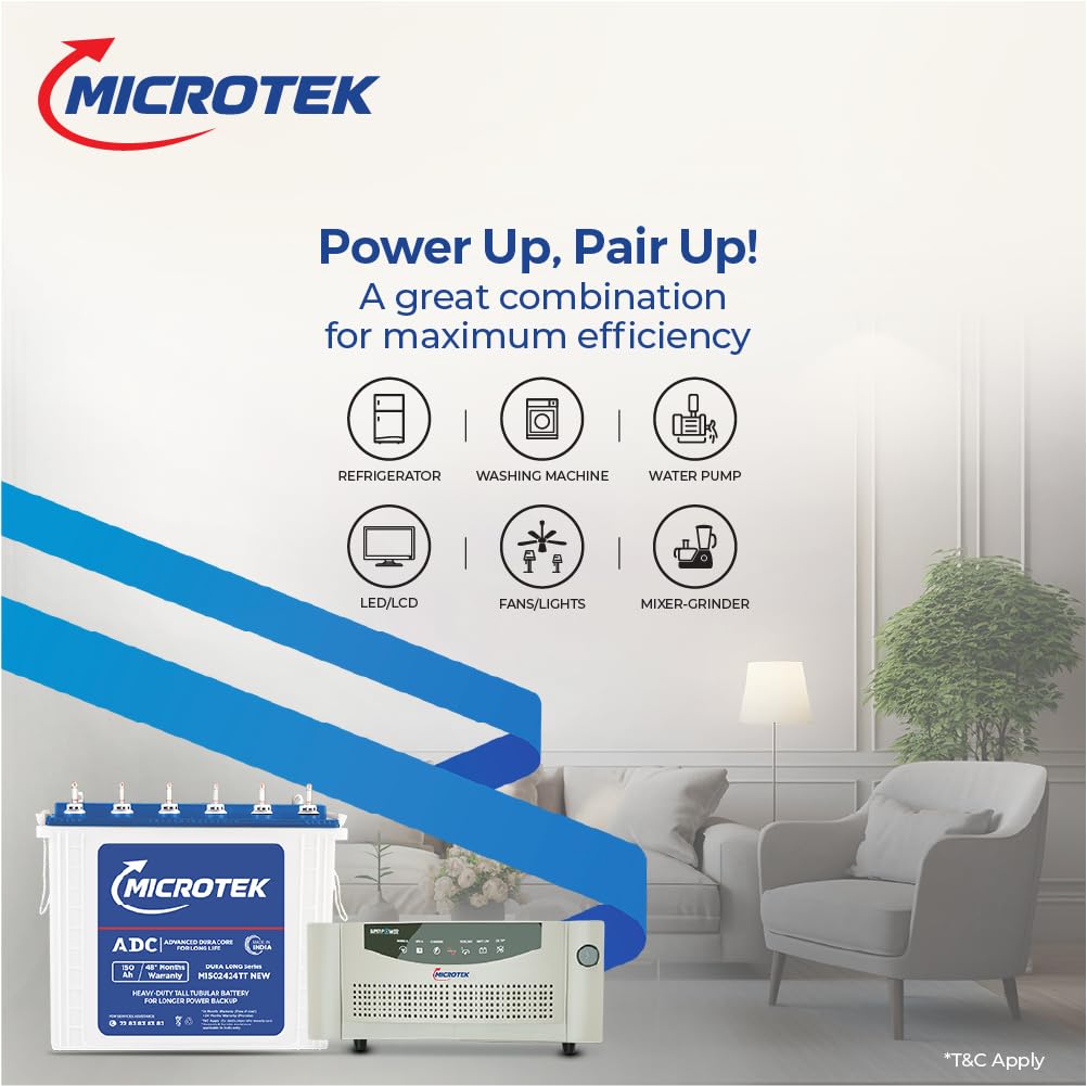 Stay powered up with the Microtek Inverter & Battery Combo, featuring the high-efficiency ENERGY SAVER UPS 825 (715VA/12V) and the durable M1502424TT 150AH tubular battery. Designed to handle frequent power cuts in Indian homes and small commercial spaces, this combo provides pure digital wave output to ensure safe and seamless operation of all your electronics. The 150AH battery offers excellent backup time and fast recharging capabilities, while the smart safety features like overload protection and deep discharge prevention ensure the longevity of both the inverter and connected appliances. Whether you're working from home, managing a small store, or simply looking to avoid interruptions during power cuts, this Microtek combo is the perfect solution for uninterrupted convenience and peace of mind.